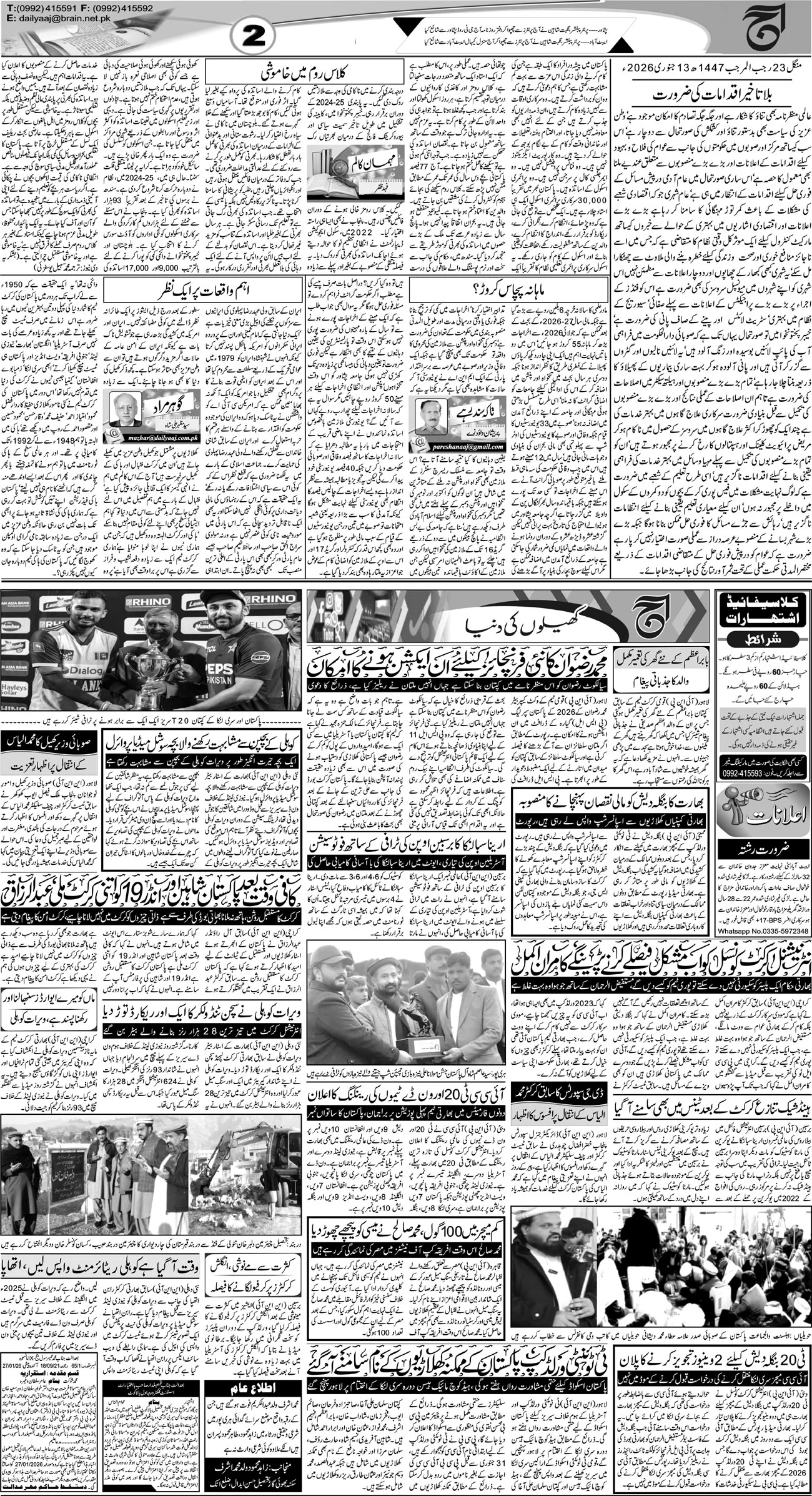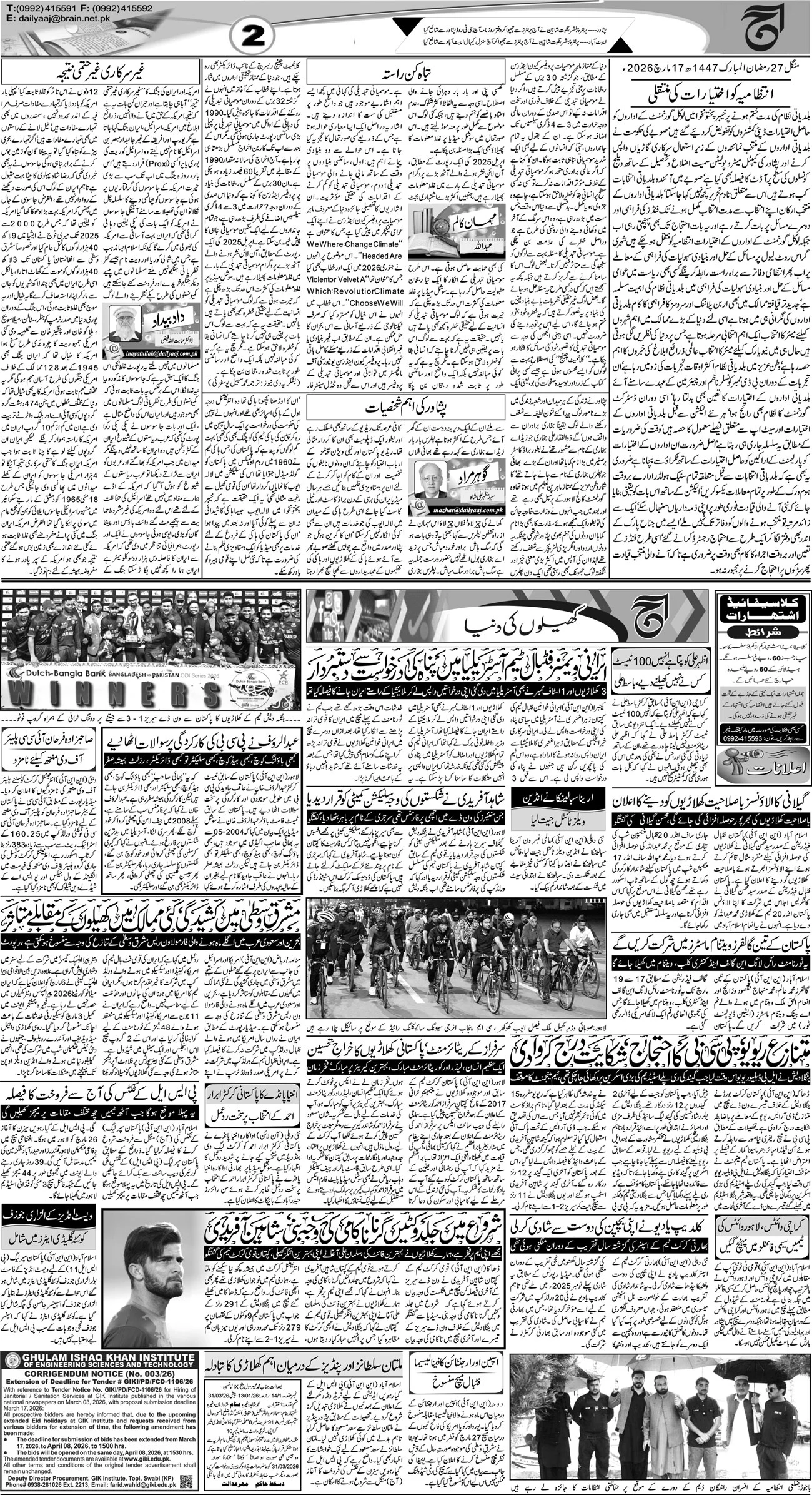 Daily Aaj | Daily Aaj Abbottabad: Daily Aaj Abbottabad Epaper Online Edition Daily Aaj Abbottabad is one of the best and most circulated Urdu newspaper in Abbottabad which is published simultaneously from Abbottabad, Islamabad and Peshawar in April 1989. Abdul Wahid Yousufi is the editor of Daily Aaj Newspaper Today online Edition is updated for Internet Users daily on 10:00 am PST. Aaj epaper , Daily Aaj Newspaper, Daily Aaj Abbottabad epaper, Daily AAJ, Daily Aaj Akhbar Abbottabad and Peshawar Editions are published daily and access through out worldwide on Internet