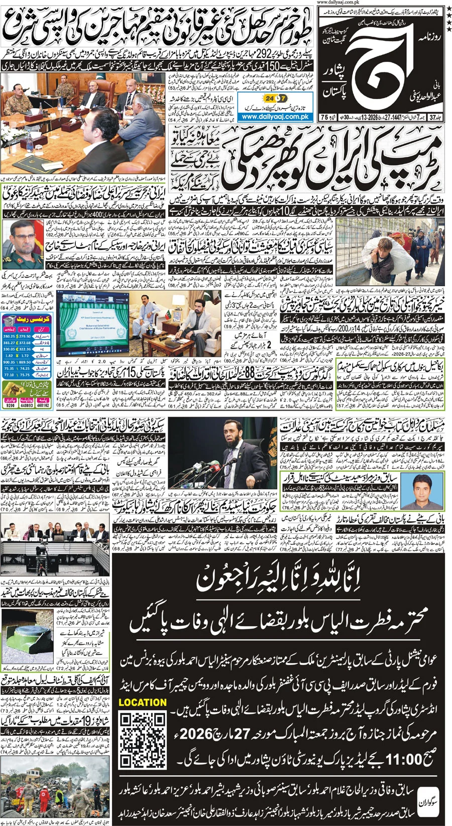 Daily Aaj Peshawar is one of the best and most circulated Urdu newspaper in Peshawar, which is published simultaneously from Abbottabad, Islamabad and Peshawar. Abdul Wahid Yousufi is the editor of Daily Aaj Newspaper Published form three cities of Pakistan, and updated daily only Peshawar and Abbottabad Editions and best epaper in KPK province. Dated: 28-03-2026