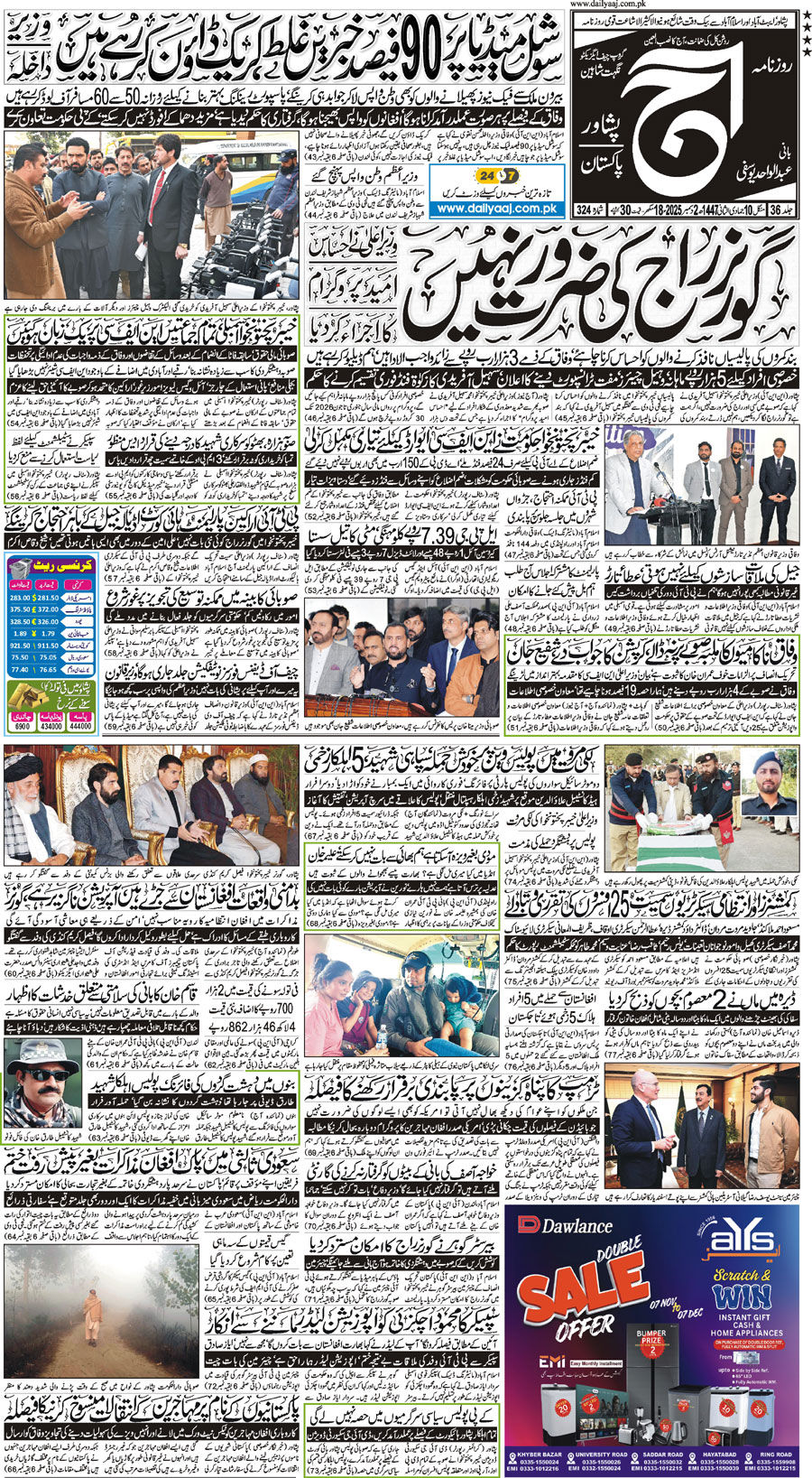 Daily Aaj Peshawar is one of the best and most circulated Urdu newspaper in Peshawar,   which is published simultaneously from Abbottabad, Islamabad and Peshawar. Abdul Wahid Yousufi is the editor of Daily Aaj Newspaper Published form three cities of Pakistan, and updated daily only Peshawar and Abbottabad Editions and best epaper in KPK province. Dated: 02-12-2025